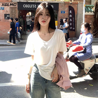 2025新款莫代爾純色短袖T恤女、夏季寬鬆V領、冰絲薄款面膜低領上衣
