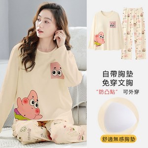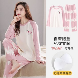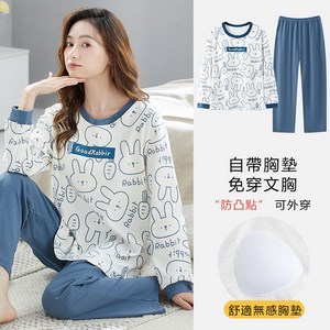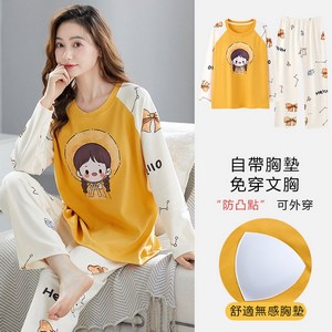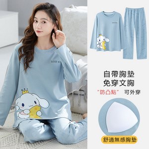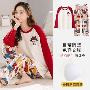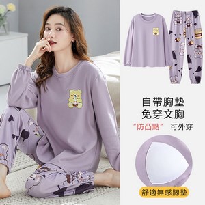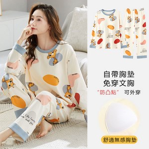 長袖睡衣女士春秋款帶胸墊防凸點家居服女寬鬆大碼2024年秋季新款